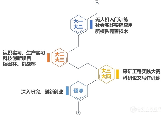 无人机采矿应用团队队员的培养将采用推进式的模式。大一和大二阶段通过以老带新接受入门级培训,通过社会实践等活动进行实际操作和应用,并鼓励同学们加入校航模队完善自身技术,争取航模比赛国家级奖励;大二和大三阶段结合采矿科技创新项目、认识实习和生产实习开始矿业领域的实际应用,并以此参加学校摇篮杯、全国挑战杯等课外学术科技作品竞赛;大三和大四阶段以队长身份带领低年级队员参加全国高等学校采矿工程专业学生实践作品大赛,开始使用测绘数据进行三维构模以及数值模拟等研究工作,并撰写科研论文。通过系统的培养提升学生创新创业能力,并为部分无法直接保研的同学铺垫学术专长保研的成长道路。